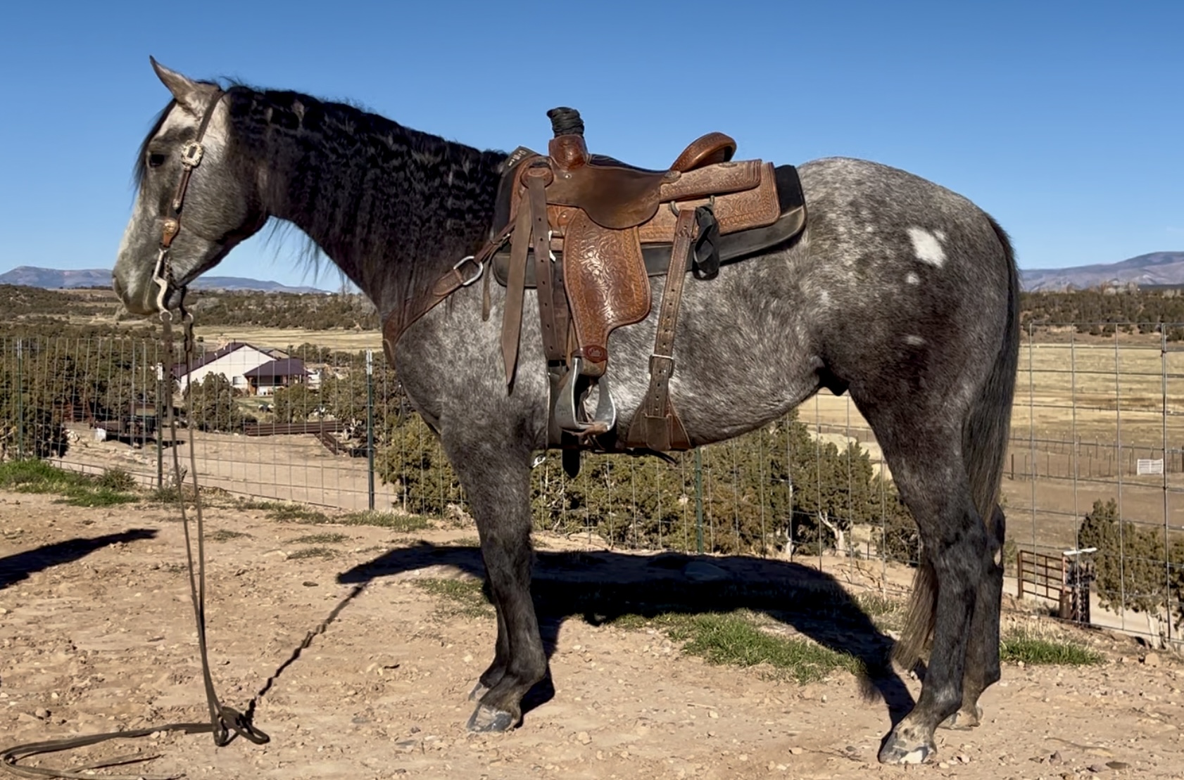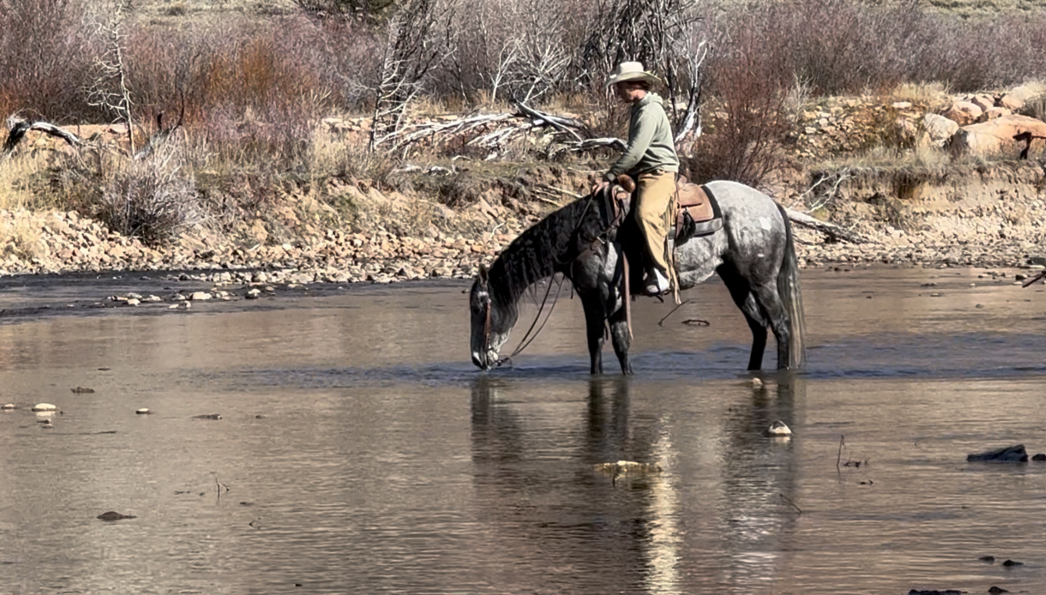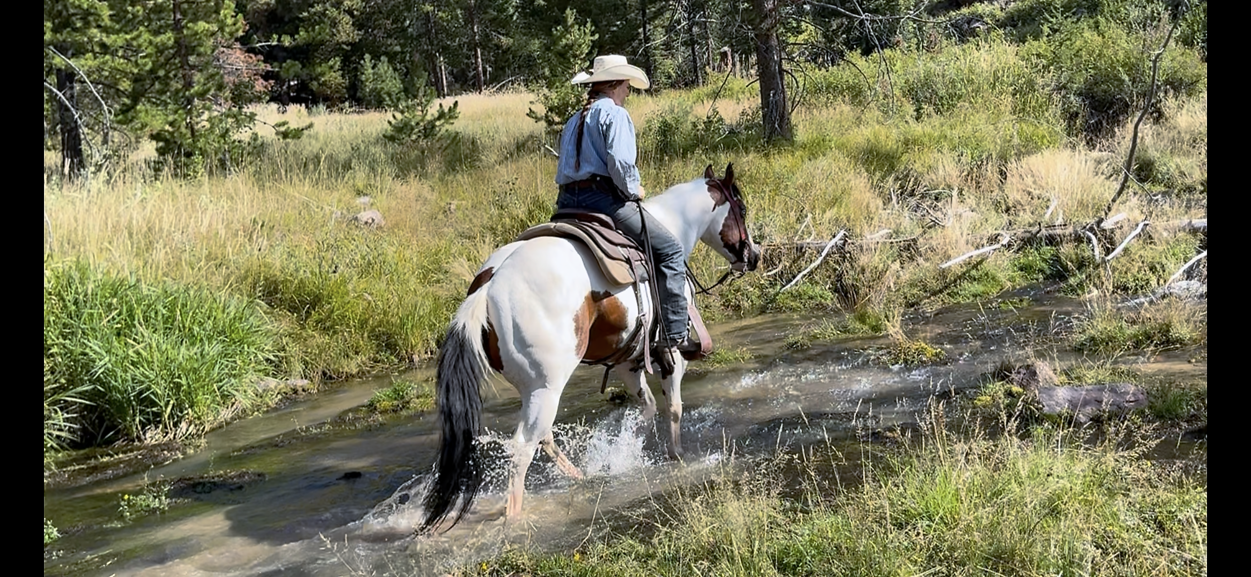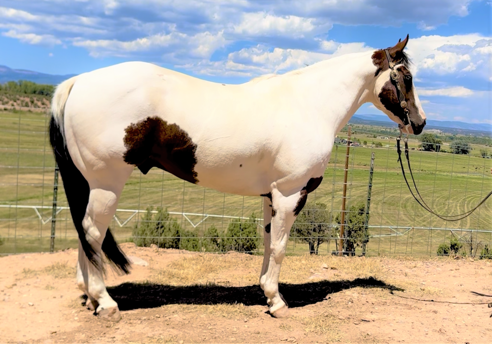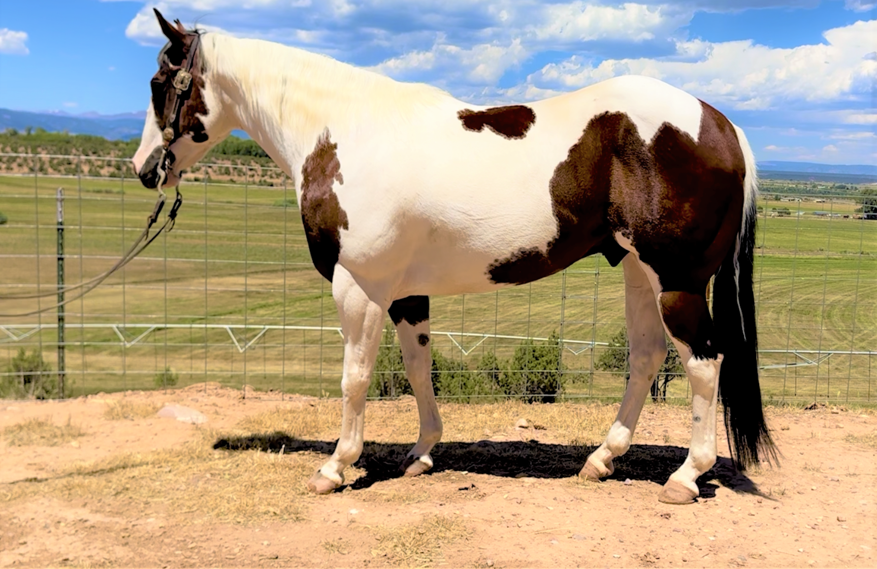 PayPal is gentle, kind, experienced and gorgeous. He has impeccable ground manners, is easy to catch, bathe, shoe, clip, haul, etc. He has seen every aspect of trail riding, mountain use, overnight trips, pushing cattle, rough country, easy days and shines in every area. He crosses anything you point him at safely and quietly, and is the same horse even if he’s had time off. PayPal rides out in a group or alone and is also an excellent pack horse. He is kind enough to make a timid rider feel at ease but broke enough to be fun for an experienced rider to enjoy. He has alot of fancy buttons but isn’t overreactive or “feely”. PayPal is also great in the arena, lopes nice circles, takes both leads easily, travels on a loose rein and is easy to handle. He has a good stop, backs, spins correctly, moves off your feet, has a nice neck rein and is easy to work gates on. He is experienced around cattle, is easy to rope the sled on, has a good start heeling in the arena, and could be used in the branding pen as well. Contact us to set up a time to come see him yourself, you won’t be disappointed.