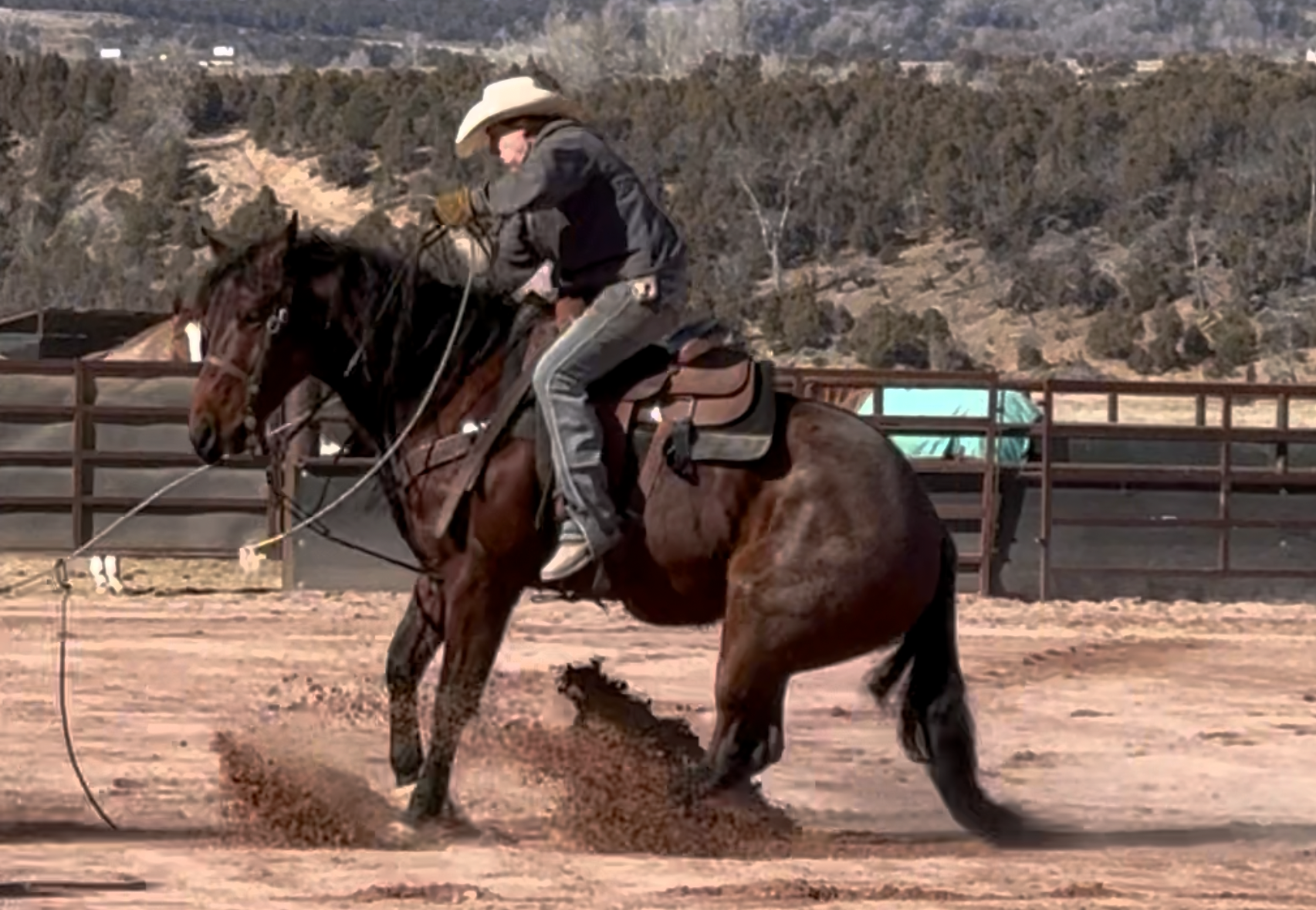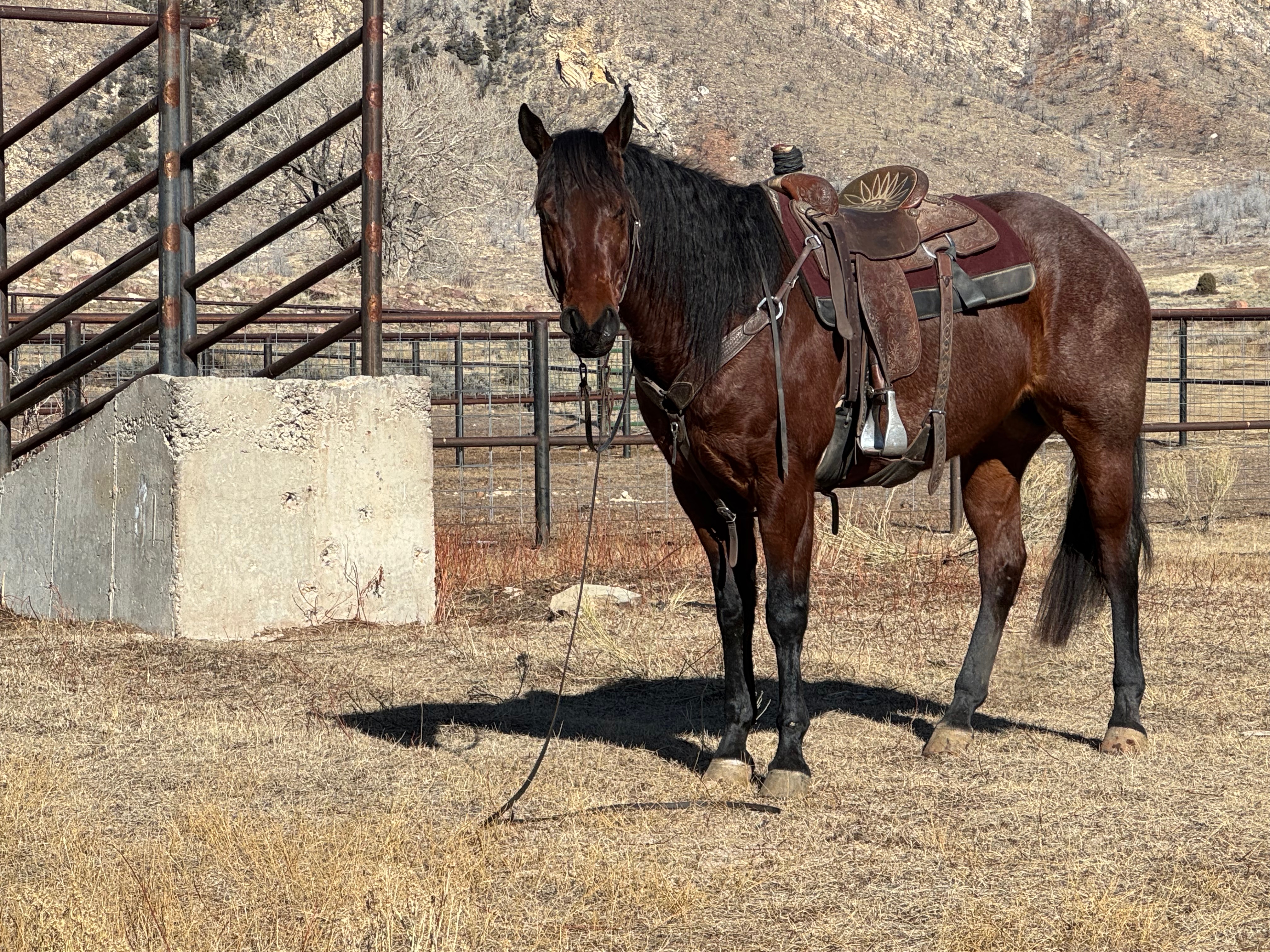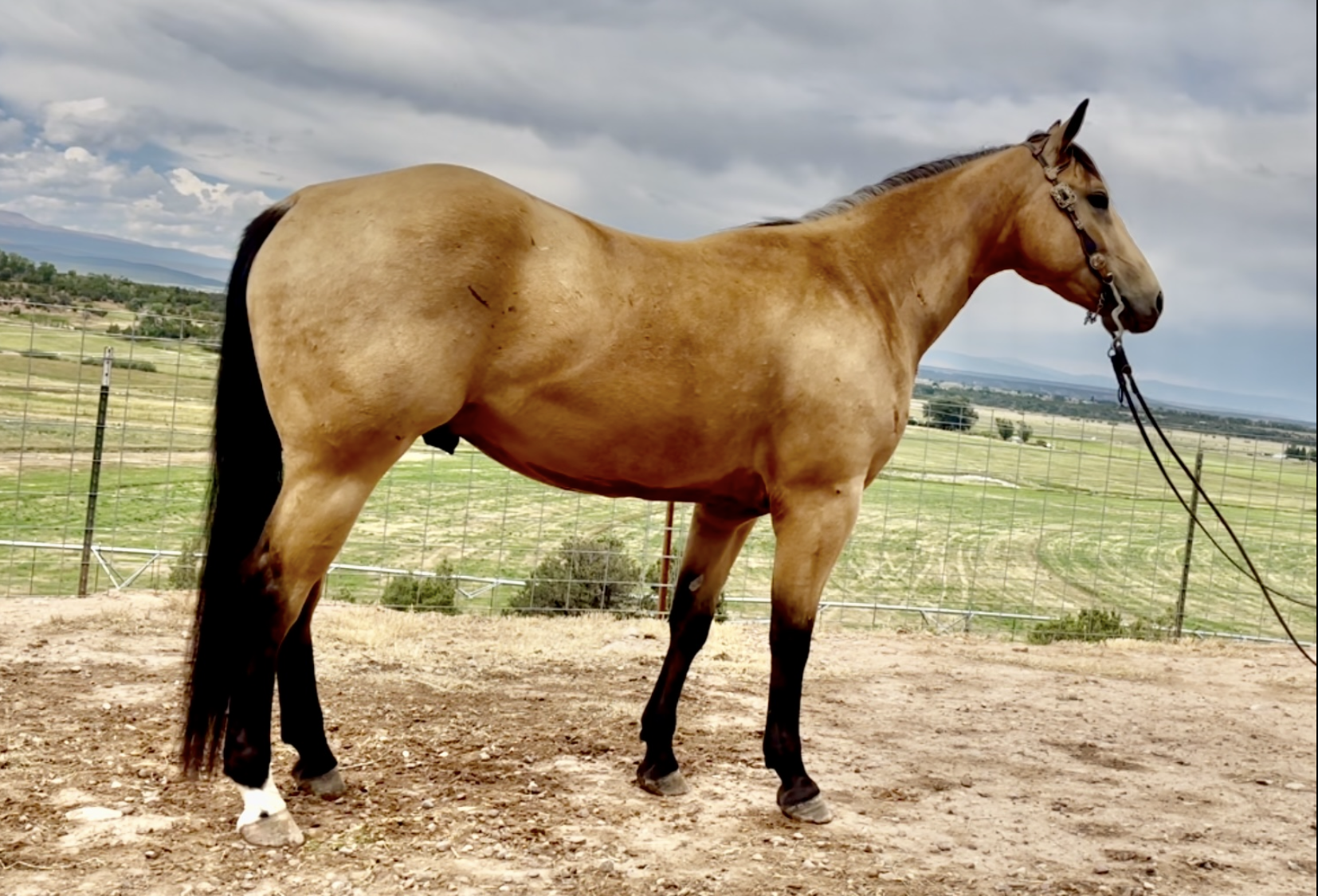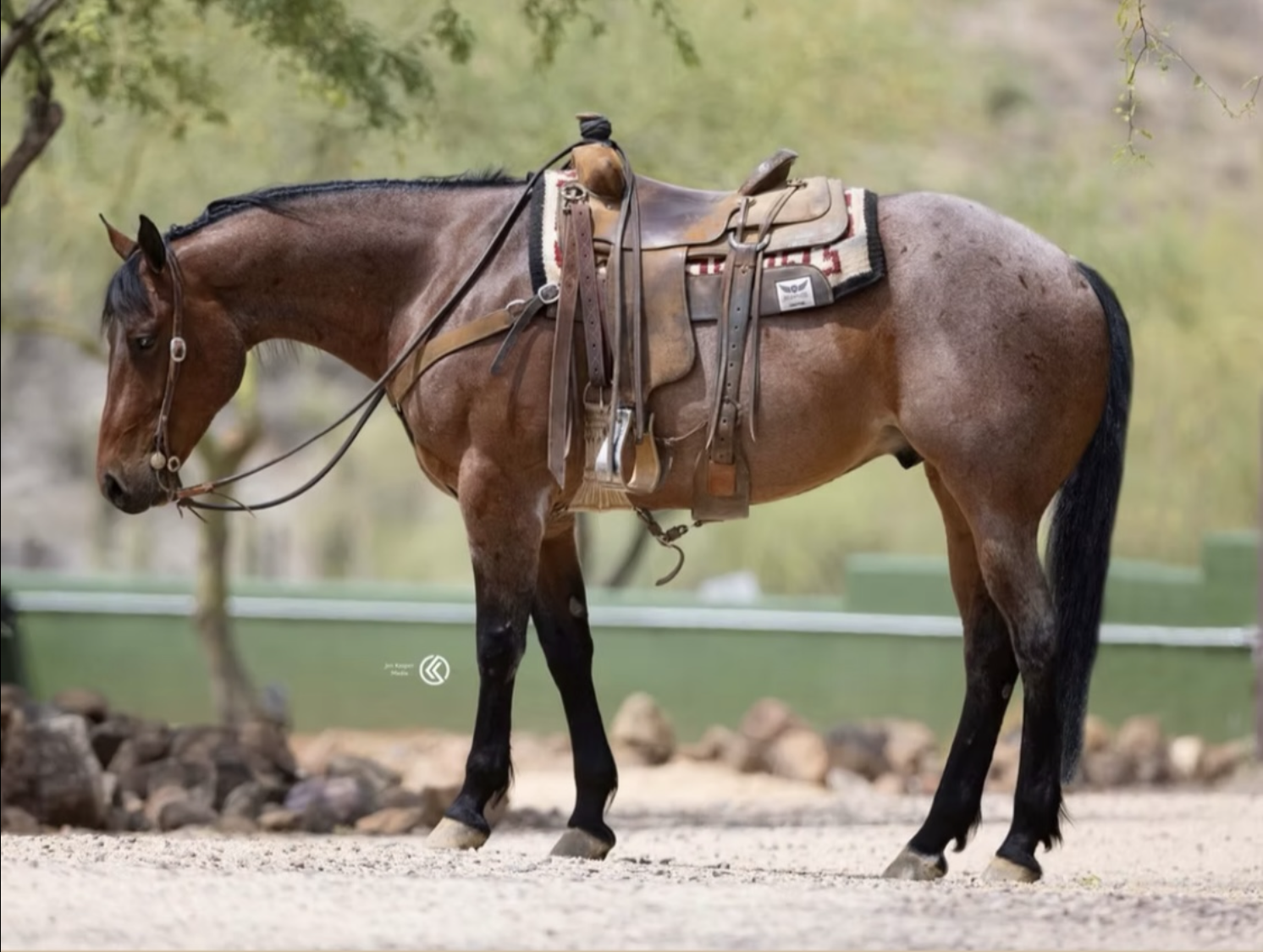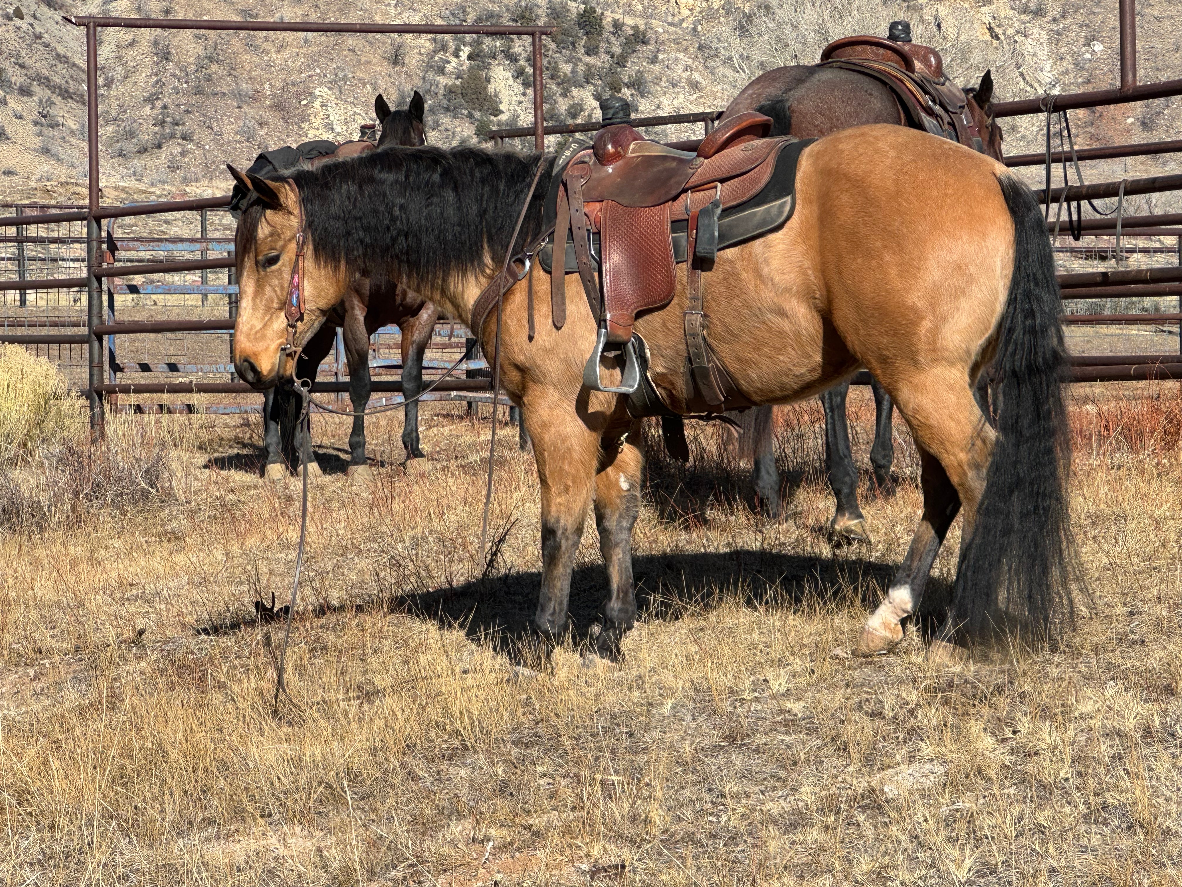 Jess came to us with only a few rides so we know everything about how he’s been started, ridden, trained etc. He is kind, gentle, friendly and talented. Jess is fancy broke with a huge stop, turns around nicely and is very respectful of the bridle and your feet. He scores well, can run down the strong cattle with ease but also has plenty of rate for the slower ones. He is honest in the corner and easy to handle steers on. He has a sharp face and is always a willing partner to the run. Heeling, he times cattle well, is never short or cheaty but is always ready with a big deep stop and is solid on the horn. Jess has been used outside as well and is always a fun smooth ride. We have enjoyed every ride on Jess, and now he is ready to go on and be someone else’s #1