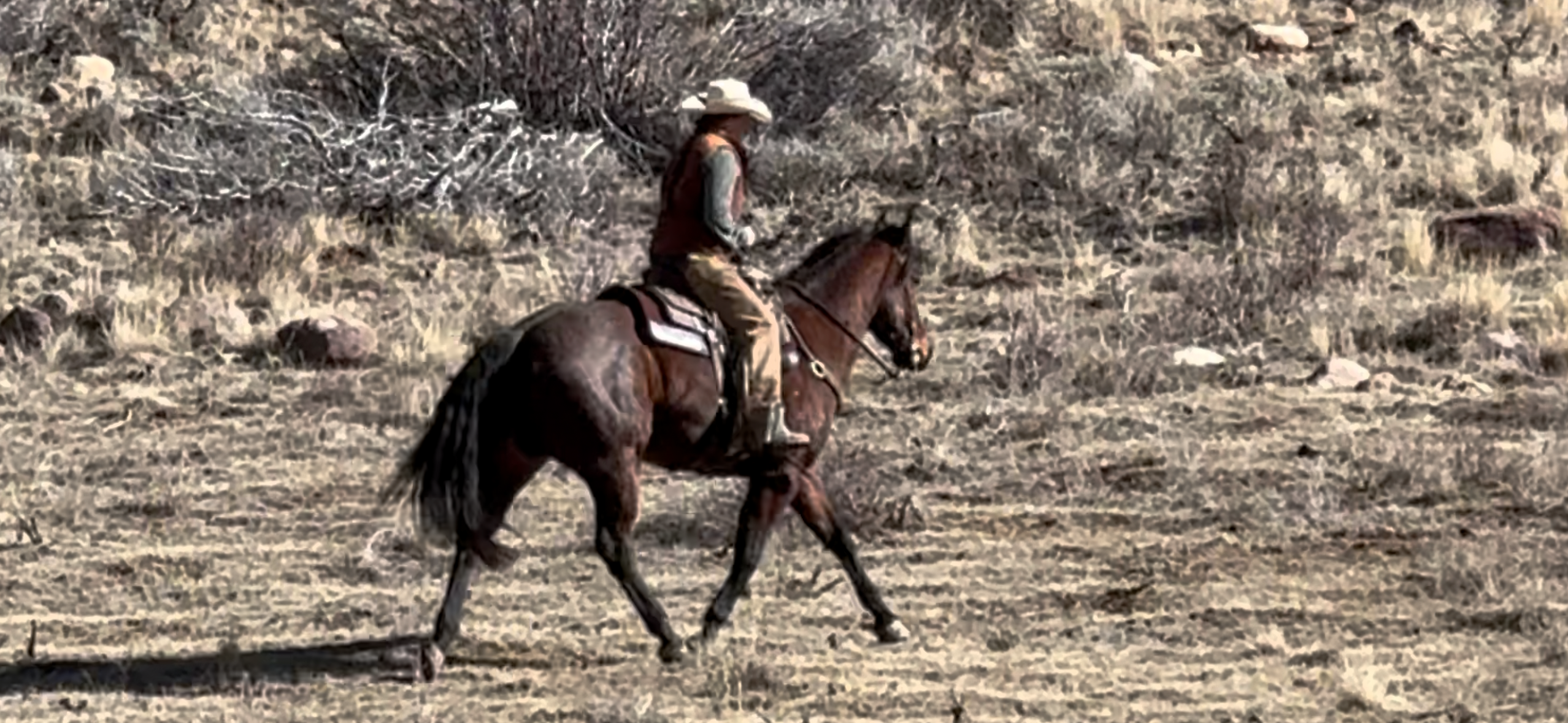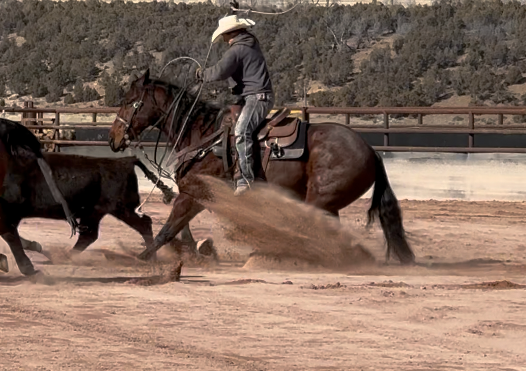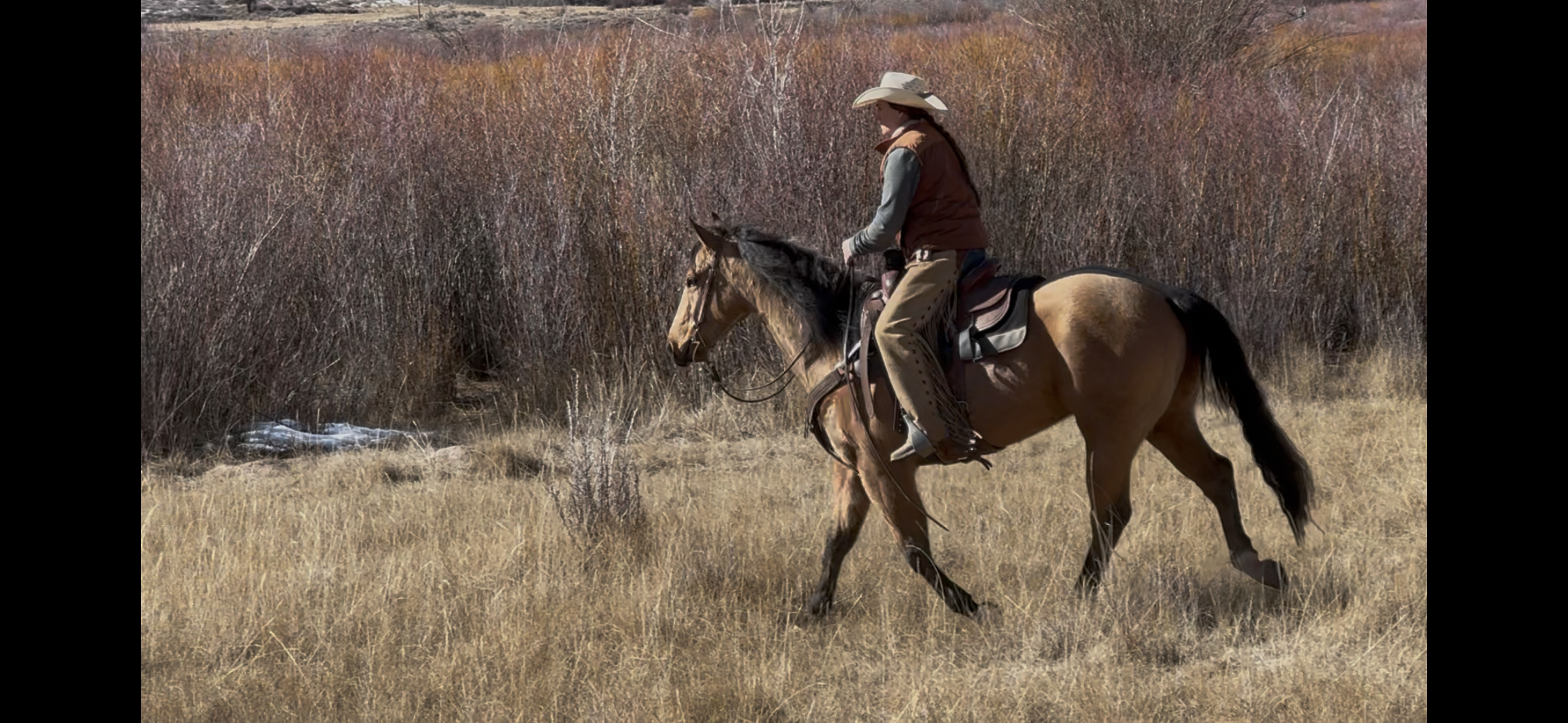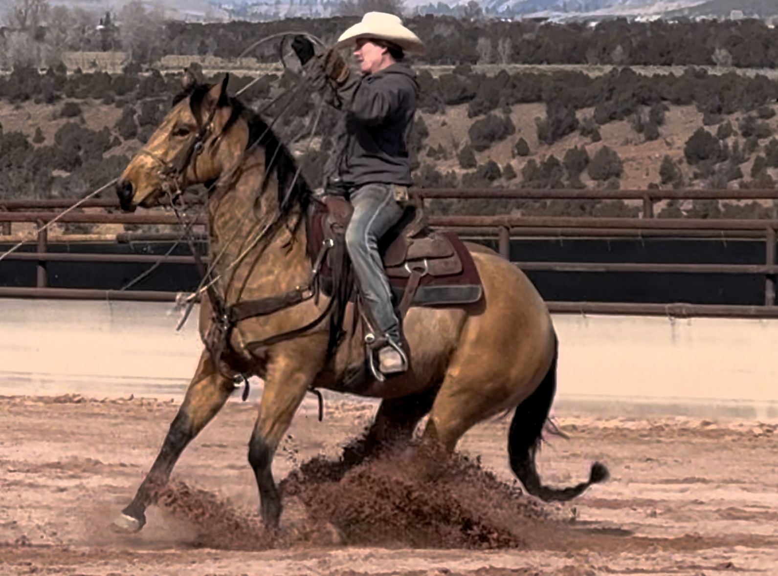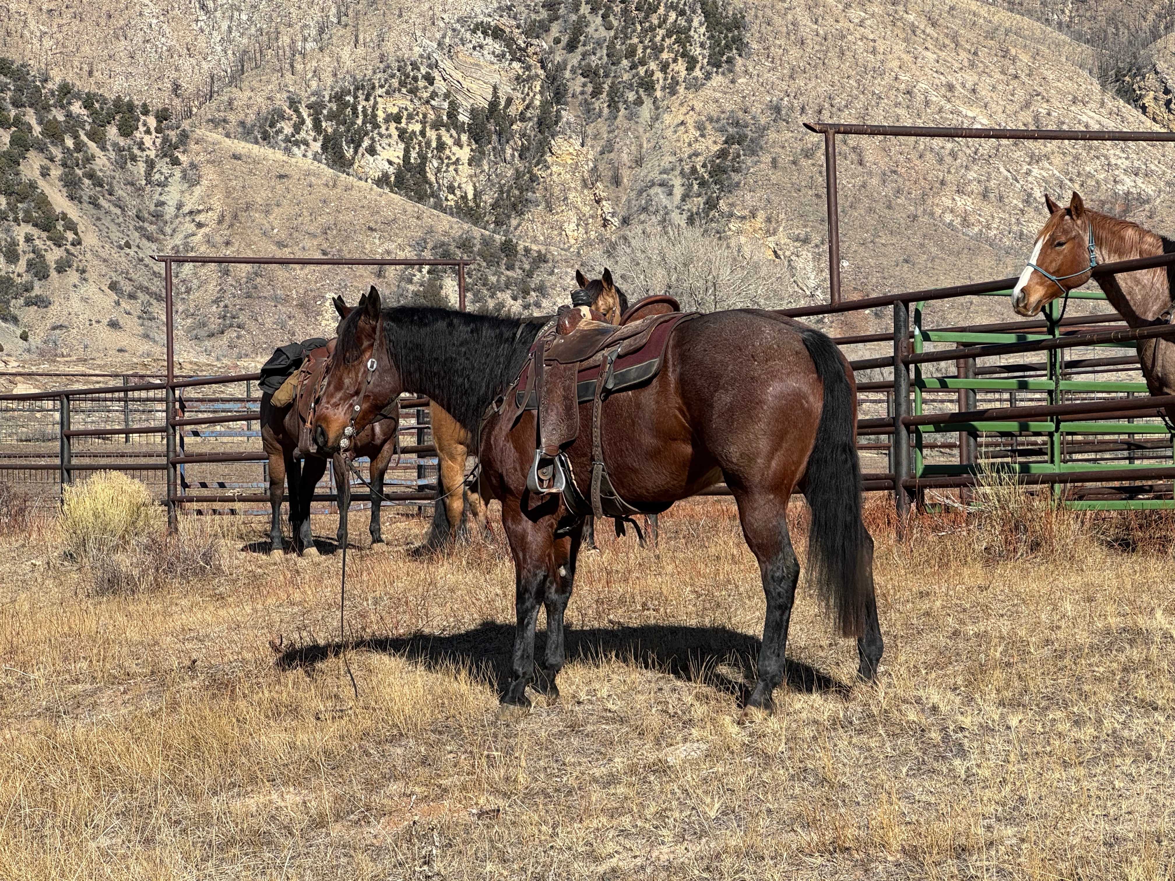 Jess came to us with only a few rides so we know everything about how he’s been started, ridden, trained etc. He is kind, gentle, friendly and talented. Jess is fancy broke with a huge stop, turns around nicely and is very respectful of the bridle and your feet. He scores well, can run down the strong cattle with ease but also has plenty of rate for the slower ones. He is honest in the corner and easy to handle steers on. He has a sharp face and is always a willing partner to the run. Heeling, he times cattle well, is never short or cheaty but is always ready with a big deep stop and is solid on the horn. Jess has been used outside as well and is always a fun smooth ride. We have enjoyed every ride on Jess, and now he is ready to go on and be someone else’s #1