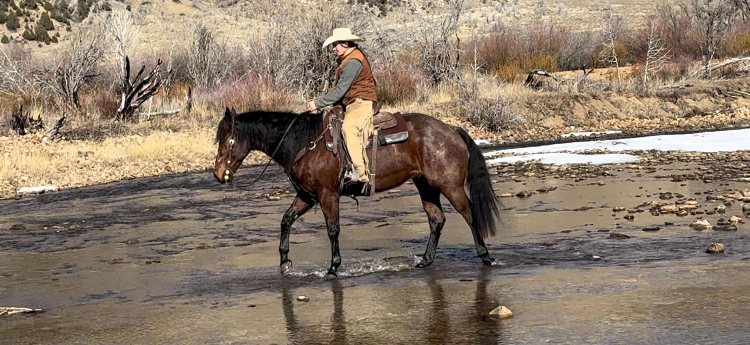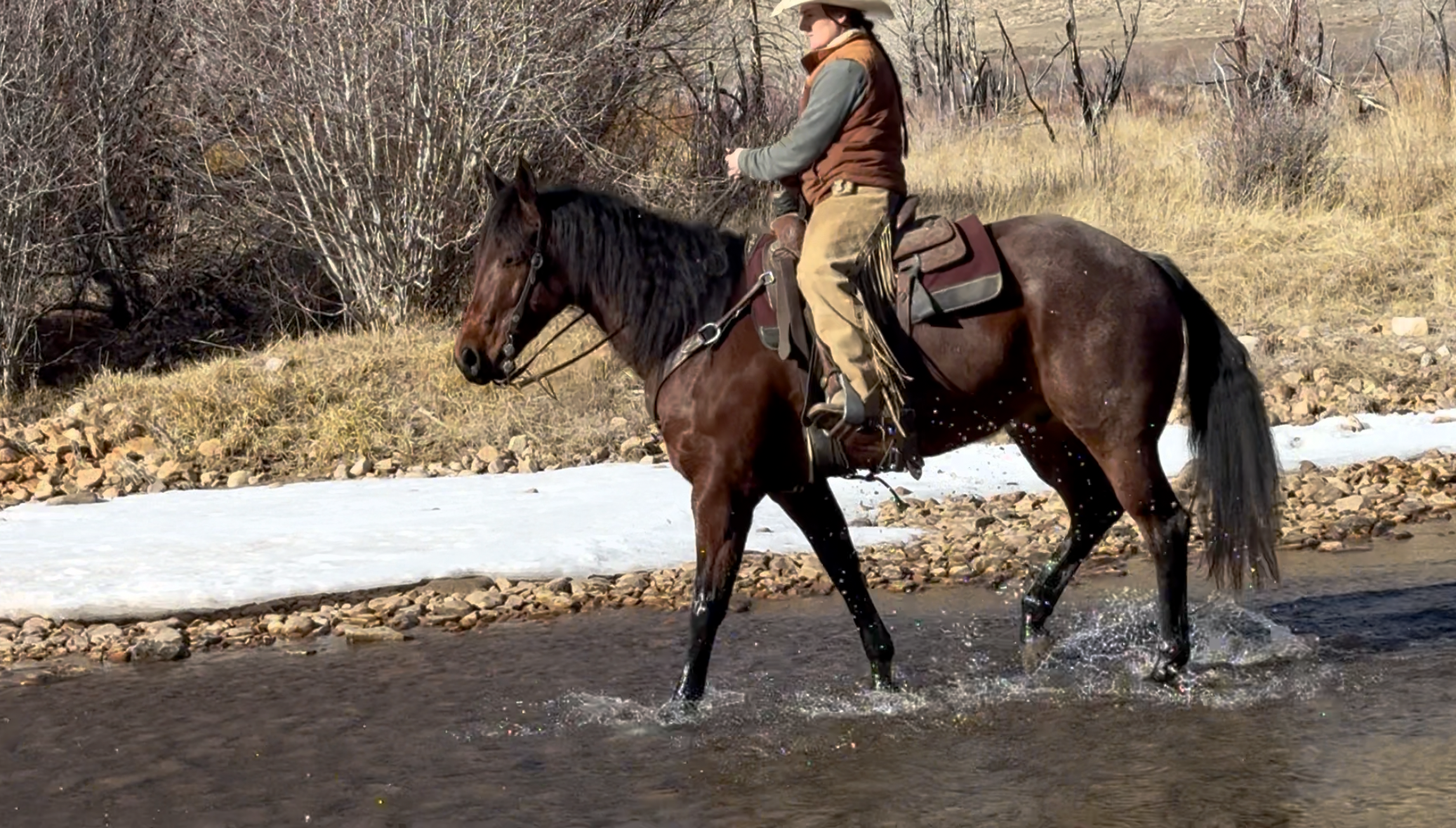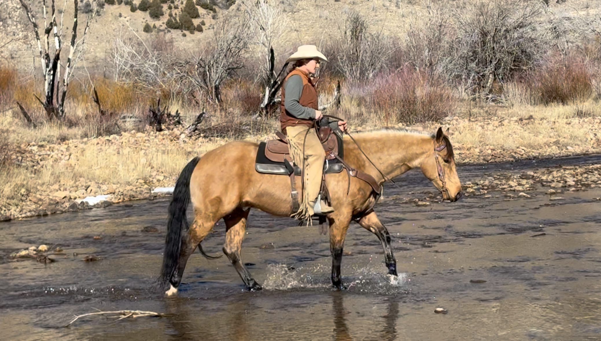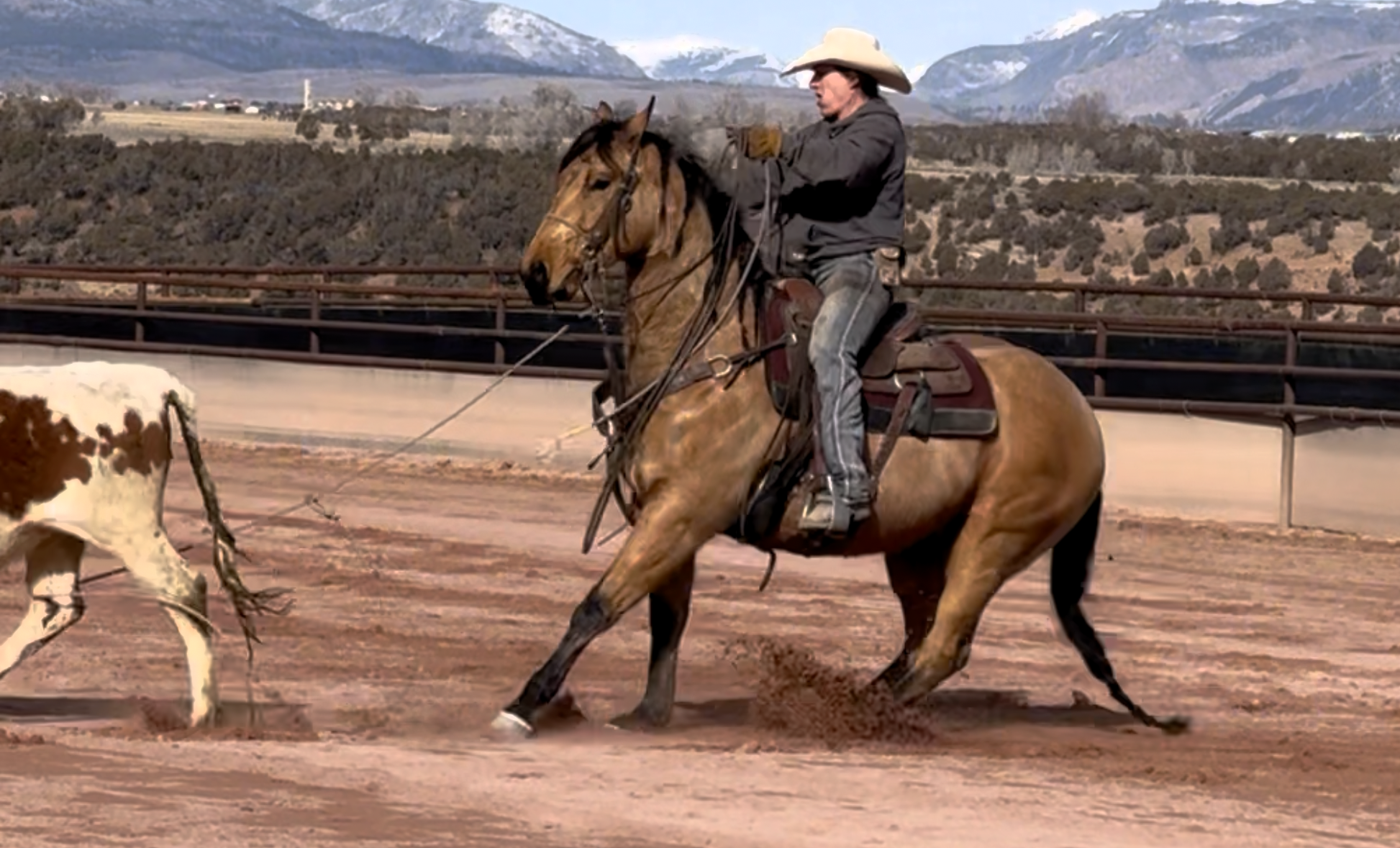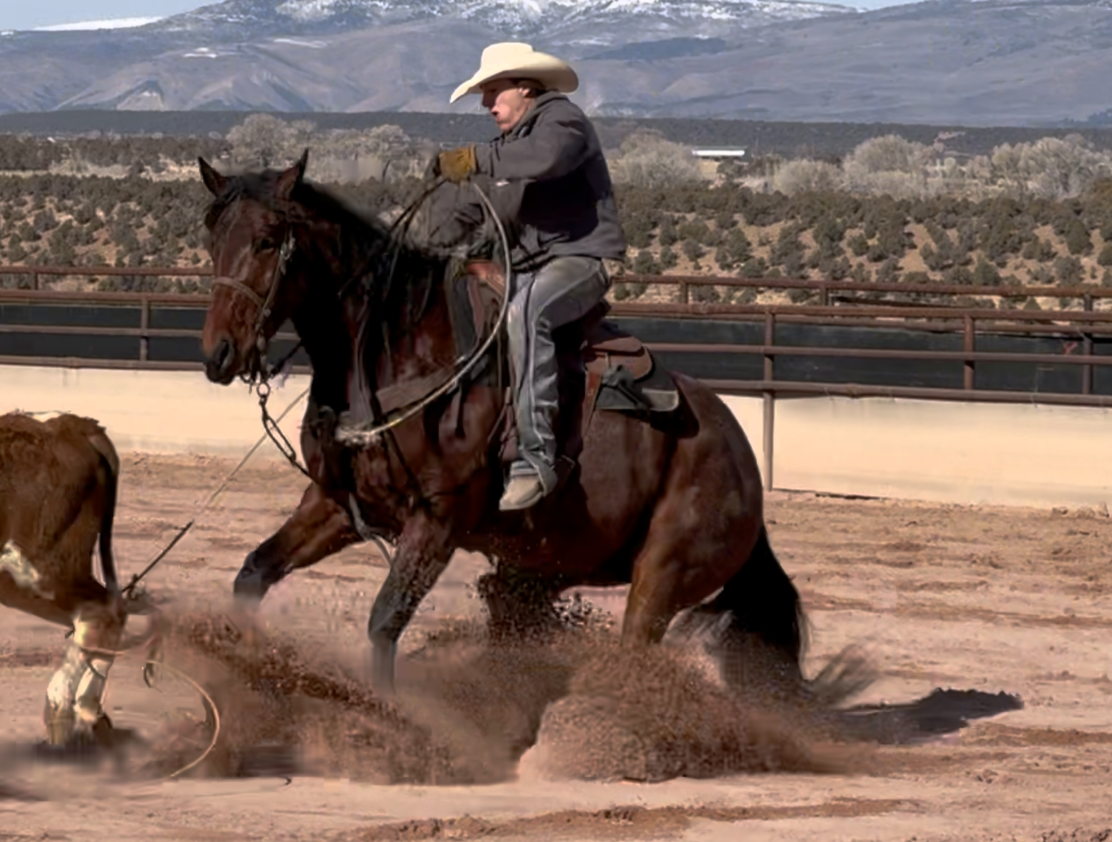 Jess came to us with only a few rides so we know everything about how he’s been started, ridden, trained etc. He is kind, gentle, friendly and talented. Jess is fancy broke with a huge stop, turns around nicely and is very respectful of the bridle and your feet. He scores well, can run down the strong cattle with ease but also has plenty of rate for the slower ones. He is honest in the corner and easy to handle steers on. He has a sharp face and is always a willing partner to the run. Heeling, he times cattle well, is never short or cheaty but is always ready with a big deep stop and is solid on the horn. Jess has been used outside as well and is always a fun smooth ride. We have enjoyed every ride on Jess, and now he is ready to go on and be someone else’s #1
