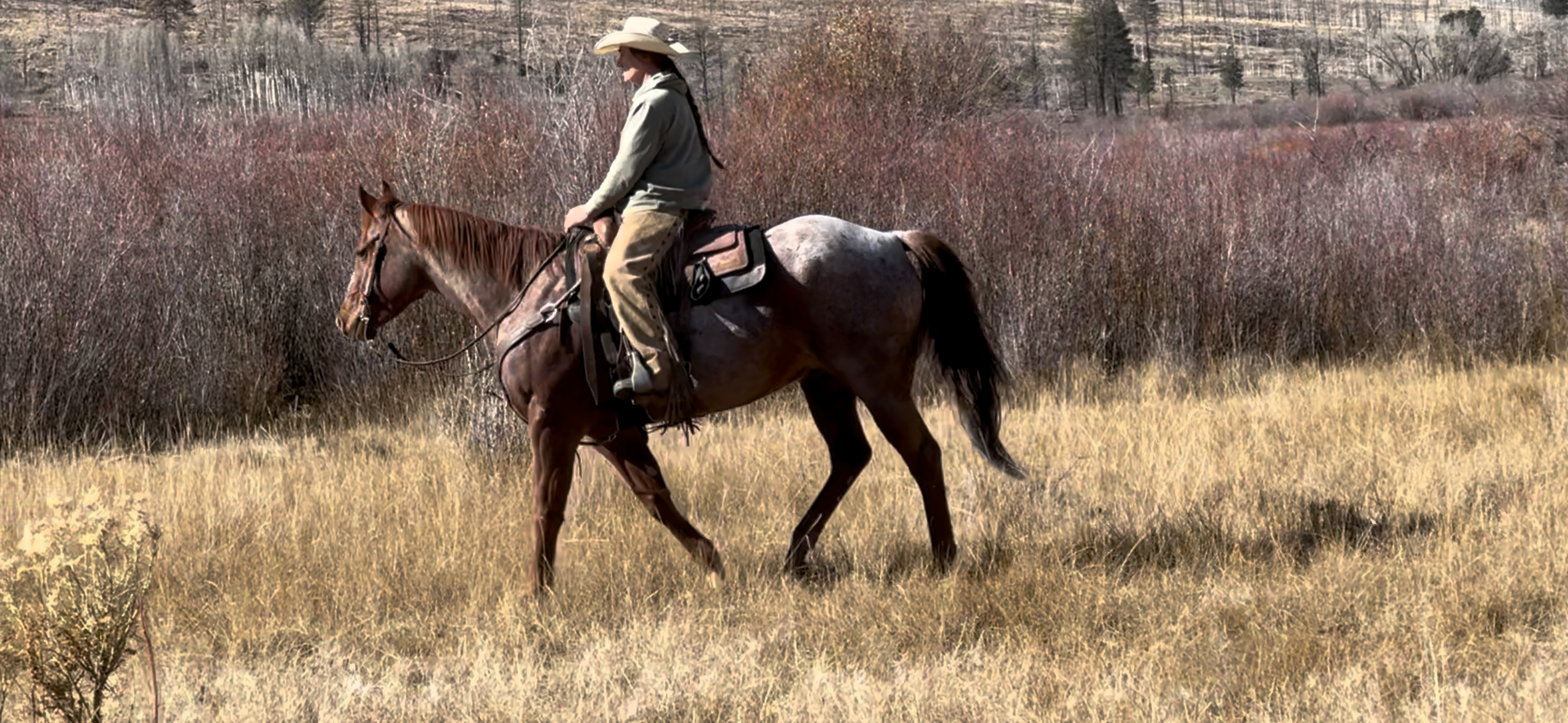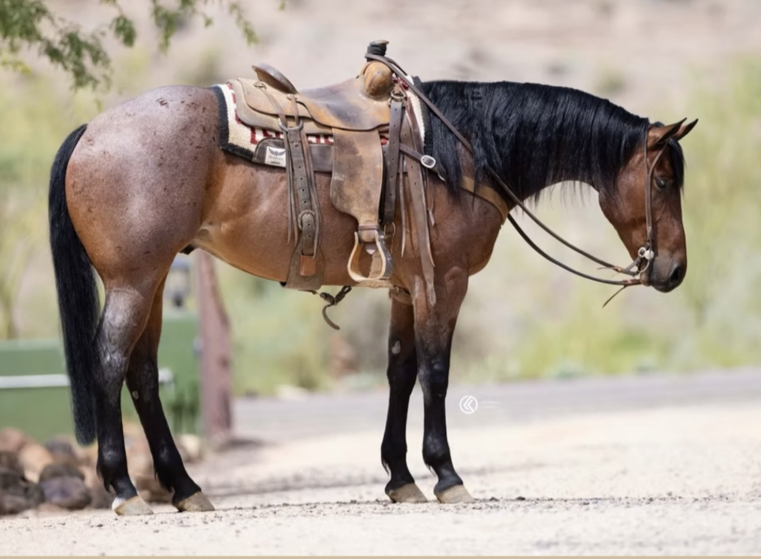 Sundance is a gorgeous red roan with the right size, ability and mentality to go win at most any level and look good doing it. While he is gentle every day and willing to work in the lower numbered ropings he also has plenty of ability and sting to step up to the high numbers and win there as well. Sundance scores well, breaks sharp and will really run cattle down, he is easy to ride, reads and rates cattle well and is strong on the horn. He stays in your hand, allows you to dictate the speed of the run, and really faces sharp. Sundance has been used outside extensively as well and is a solid partner every day. He’s quiet but travels out nice, crosses anything you point him at and rides easy all day. Sundance is easy to catch, clip, bathe, haul etc. He is fancy broke with all the cool buttons and a lot of feel. Sundance stays gentle and has never offered to buck or do anything foolish. He has clean legs, good feet, and requires zero maintenance. He is ready to go win and be enjoyed by most anyone.